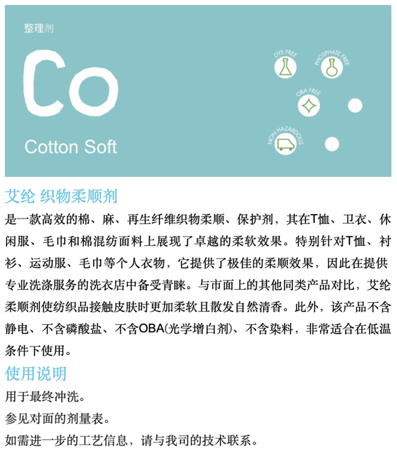 艾纶柔顺剂(Cotton Soft)是一款高效的棉、麻、再生纤维织物柔顺、保护剂,其在T恤、卫衣、休闲服、毛巾和棉混纺面料上展现了卓越的柔软效果。特别针对T恤、衬衫、运动服、毛巾等个人衣物,它提供了极佳的柔顺效果,因此在提供专业洗涤服务的洗衣店中备受青睐。与市面上的其他同类产品对比比,艾纶柔顺剂使纺织品接触皮肤时更加柔软且散发自然清香。此外,该产品不含静电、不含磷酸盐、不含OBA(光学增白剂)、不含染料,非常适合在低温条件下使用。
