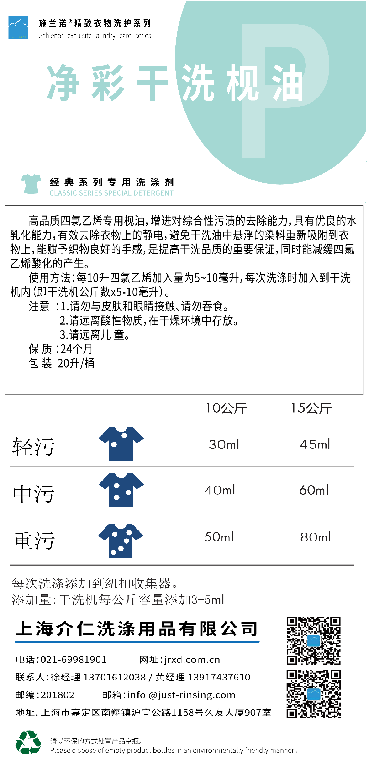 高品质四氯乙烯专用视油,增进对综合性污渍的去除能力,具有优良的水乳化能力,有效去除衣物上的静电,避免干洗油中悬浮的染料重新吸附到衣物上,能赋予织物良好的手感,是提高干洗品质的重要保证,同时能减缓四氯乙烯酸化的产生。pH值:7.5