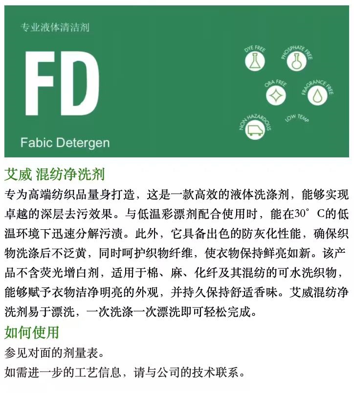 艾威混纺净洗剂(主洗剂)(Fabic Detergent),采用欧洲尖端技术制造,原装进口,专为高端纺织品量身打造。这是一款高效的液体洗涤剂,能够实现卓越的深层去污效果。与低温彩漂剂配合使用时,能在30℃的低温环境下迅速分解污渍。此外,它具备出色的防灰化性能,确保织物洗涤后不泛黄,同时呵护织物纤维,使衣物保持鲜亮如新。该产品不含荧光增白剂,适用于棉、麻、化纤及其混纺的可水洗织物,能够赋予衣物洁净明亮的外观,并持久保持舒适香味。艾威混纺净洗剂易于漂洗,一次洗涤一次漂洗即可轻松完成。