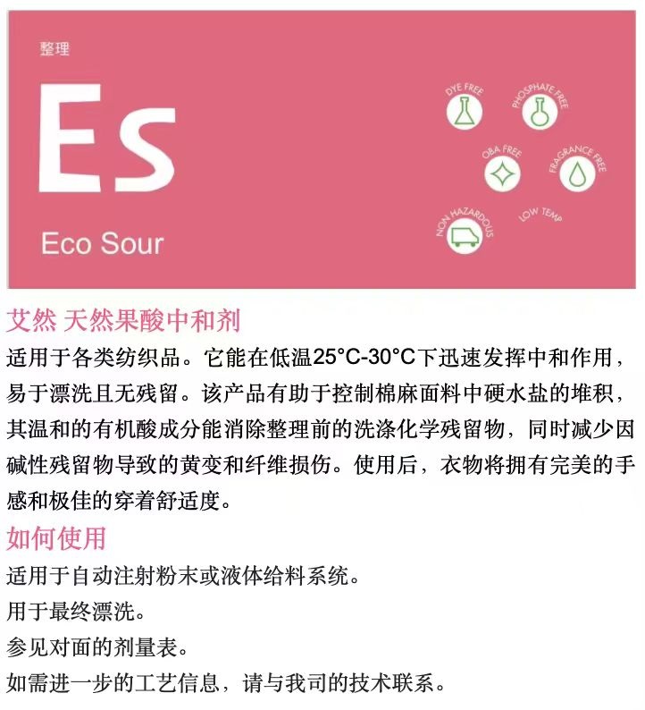 天然果酸中和剂(Eco Sour)采用欧洲先进技术生产,原装进口,适用于各类纺织品。它能在低温25°C-30°C下迅速发挥中和作用,易于漂洗且无残留。该产品有助于控制棉麻面料中硬水盐的堆积,其温和的有机酸成分能消除整理前的洗涤化学残留物,同时减少因碱性残留物导致的黄变和纤维损伤。使用后,衣物将拥有完美的手感和极佳的穿着舒适度。