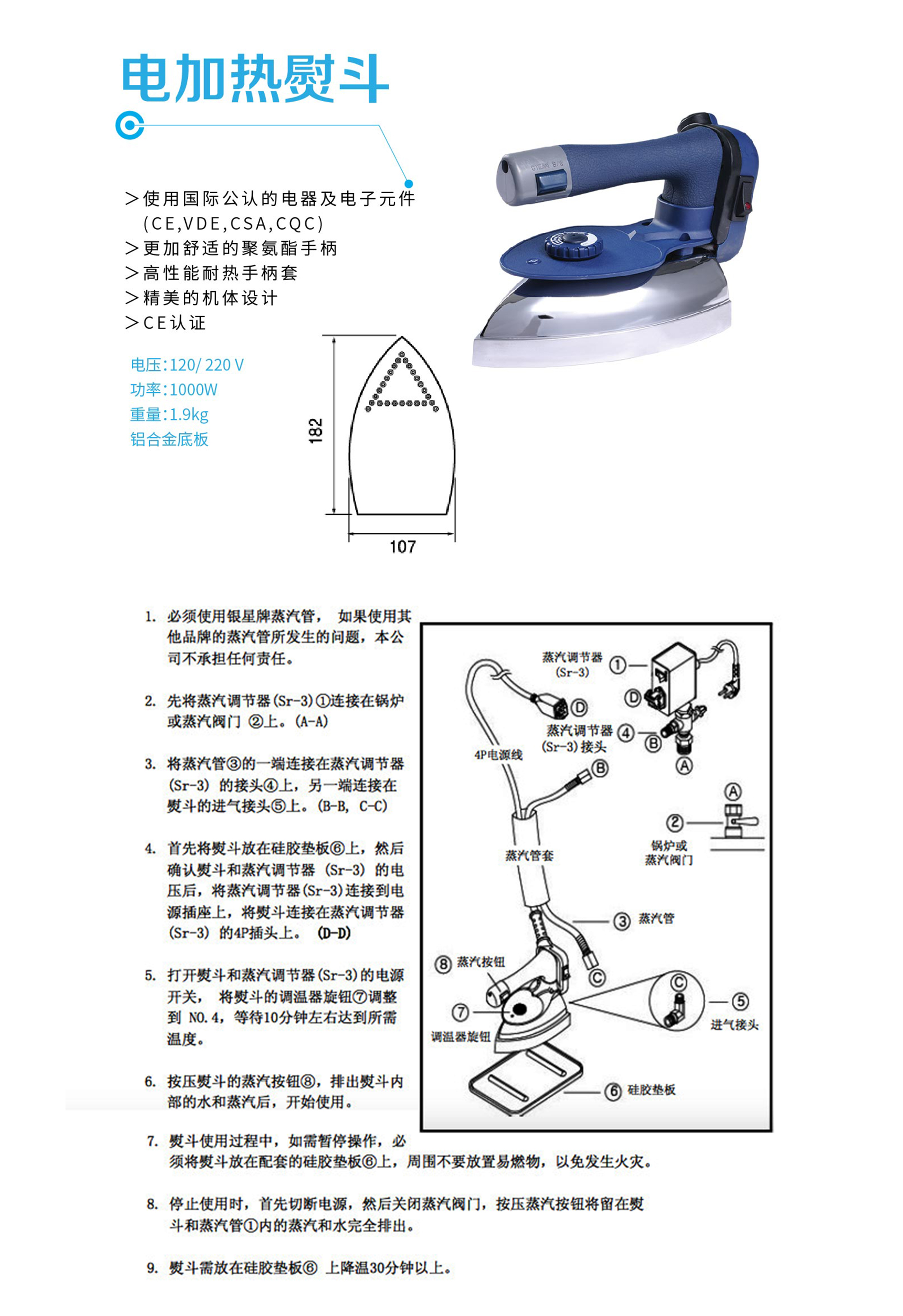 2. 在锅炉中产生的第一次蒸汽,进入熨斗内部后,由熨斗的电热管第二次加热可以喷出强大干燥的高温蒸汽,提高了工作效率。
