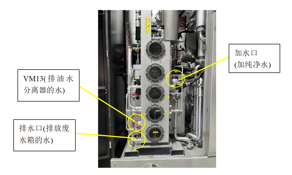 (打开VM13号阀门,排空水份,上层干洗油不要排出,并且从加水口加入纯净水)
